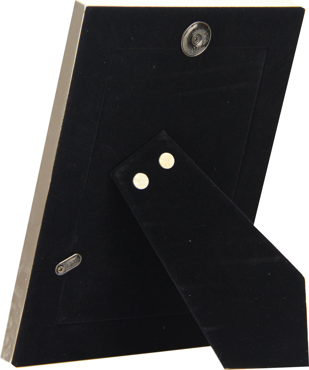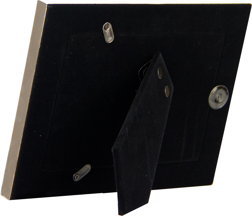 Kovinski okvir za slike – fotografije vašemu spominu doda posebno vrednost. Na žametni hrbtni steni je pritrjeno stojalo oziroma nogica, da lahko okvir postavite na mizo. Za svečane priložnosti.