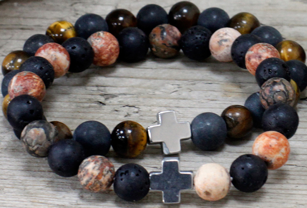 Zapestnici leopardjega jaspisa (moč, pogum) in vulkanskega kamna (pomiritev, vez z naravo) sta narejeni iz kroglic premera 8 mm. Popolno darilo za 2 prijatelja ali prijateljici, za vsakogar.