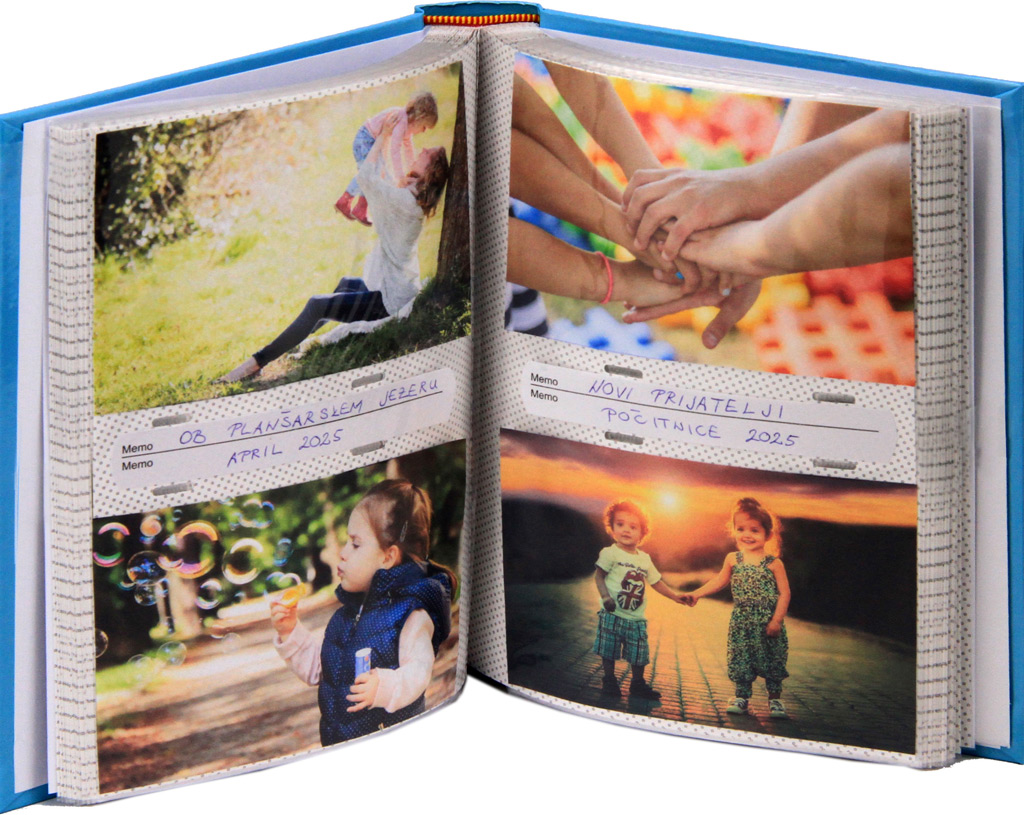 V vložni album shranite 200 fotografij dimenzije 10×15. Slike vložite v žepke v fotoalbum, ki je knjigoveško vezan. Vsaka stran ima memo prostor, kamor vpišete spomine.
