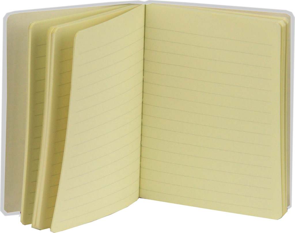 Notes – beležka s trdimi platnicami in elastiko za zapiranje ima 96 črtastih listov bele barve. Velikost zvezka je 9×14 cm, gramatura papirja je 80 g/m2. Vsebuje tudi tekstilno kazalo.