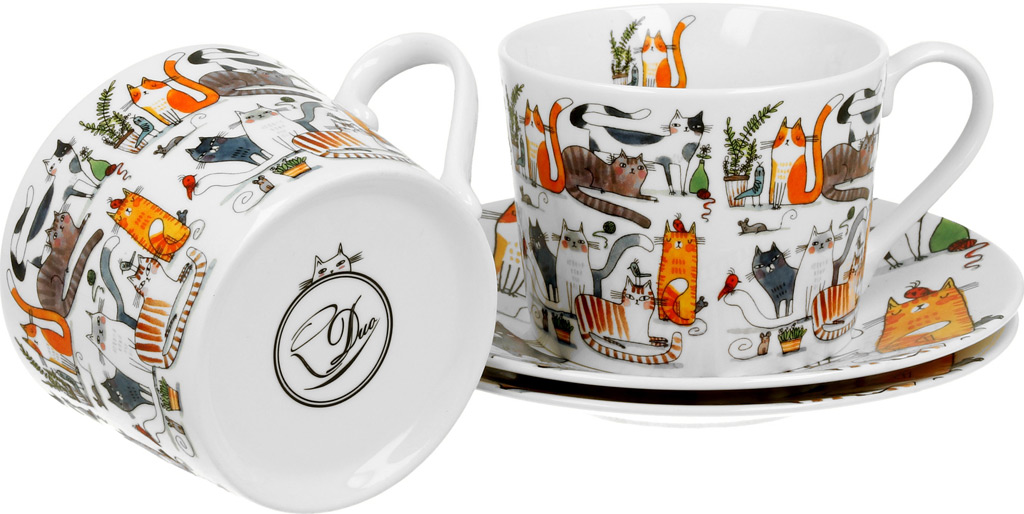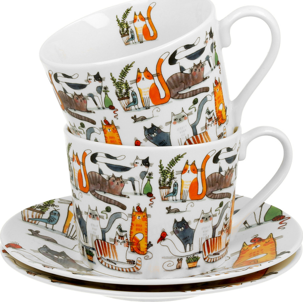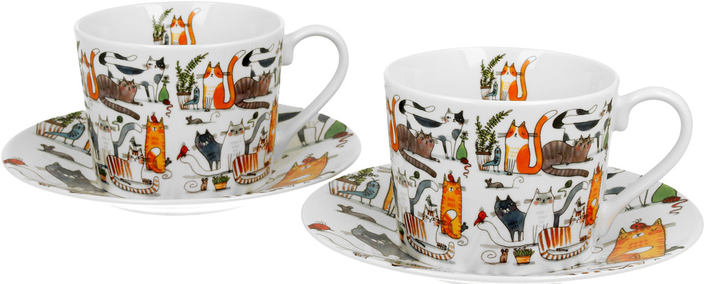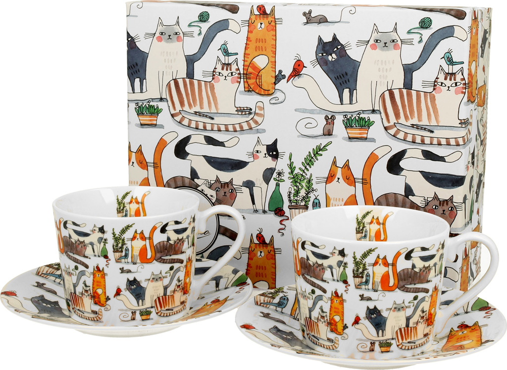 Eleganten set 2 skodelic in krožničkov za kavo ali čaj. Navihan motiv muckov. Porcelan, 230 ml. Lična embalaža, nadvse primerna za darilo.