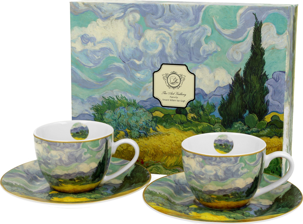 Eleganten set 2 skodelic in krožničkov za espresso. Pšenično polje (Van Gogh). Porcelan, 90 ml. Lična embalaža, nadvse primerna za darilo.