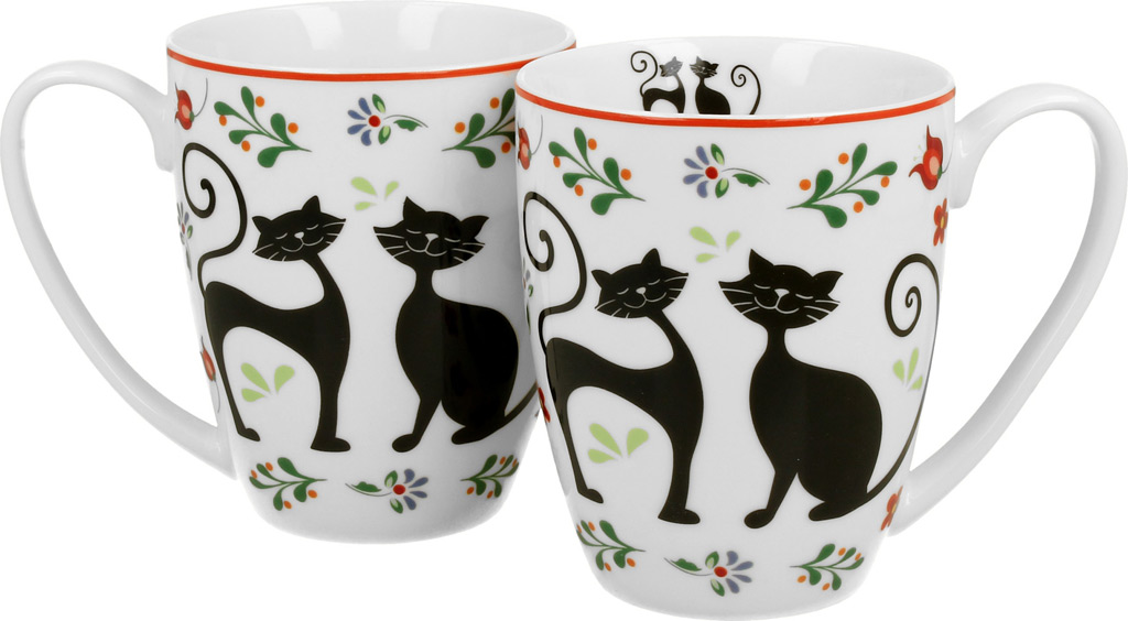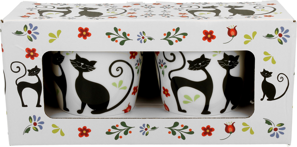Eleganten set 2 skodelic iz porcelana za kavo ali čaj. Prikupni živalski motiv Mucki. Porcelan, 360 ml. Lična embalaža, nadvse primerna za darilo.