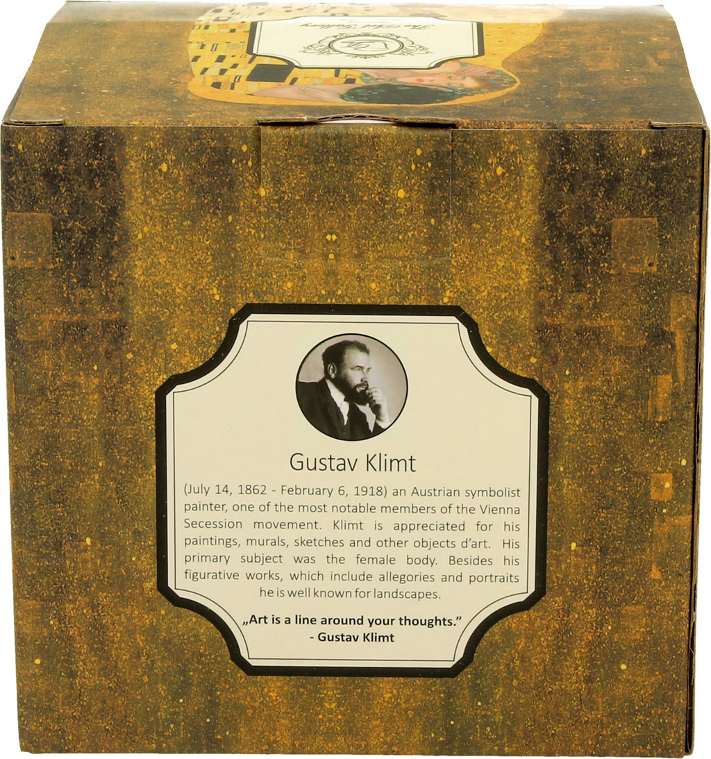Elegantna skodelica iz porcelana za kavo ali čaj. Priljubljen motiv Poljub priznanega umetnika Klimt. Porcelan, 370 ml. Lična embalaža, nadvse primerna za darilo.