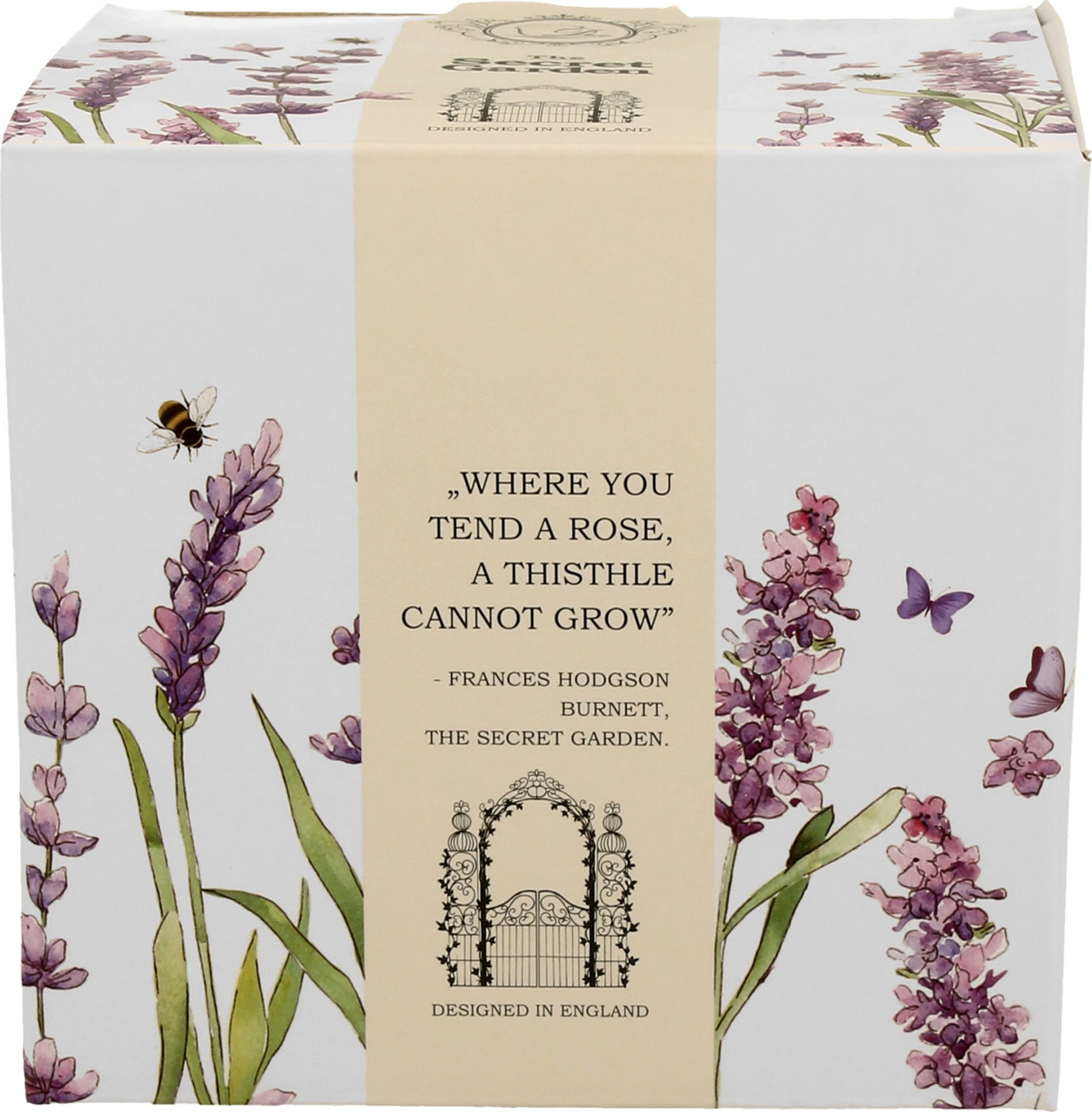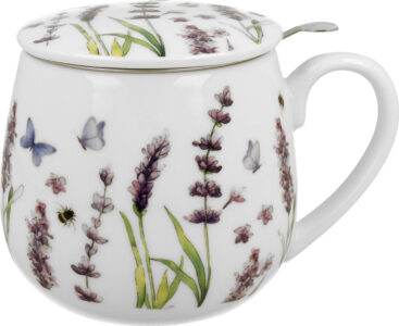 Eleganten komplet skodelice, pokrova in cedila za čaj. Priljubljen motiv sivke. Porcelan, 430 ml. Lična embalaža, nadvse primerna za darilo.